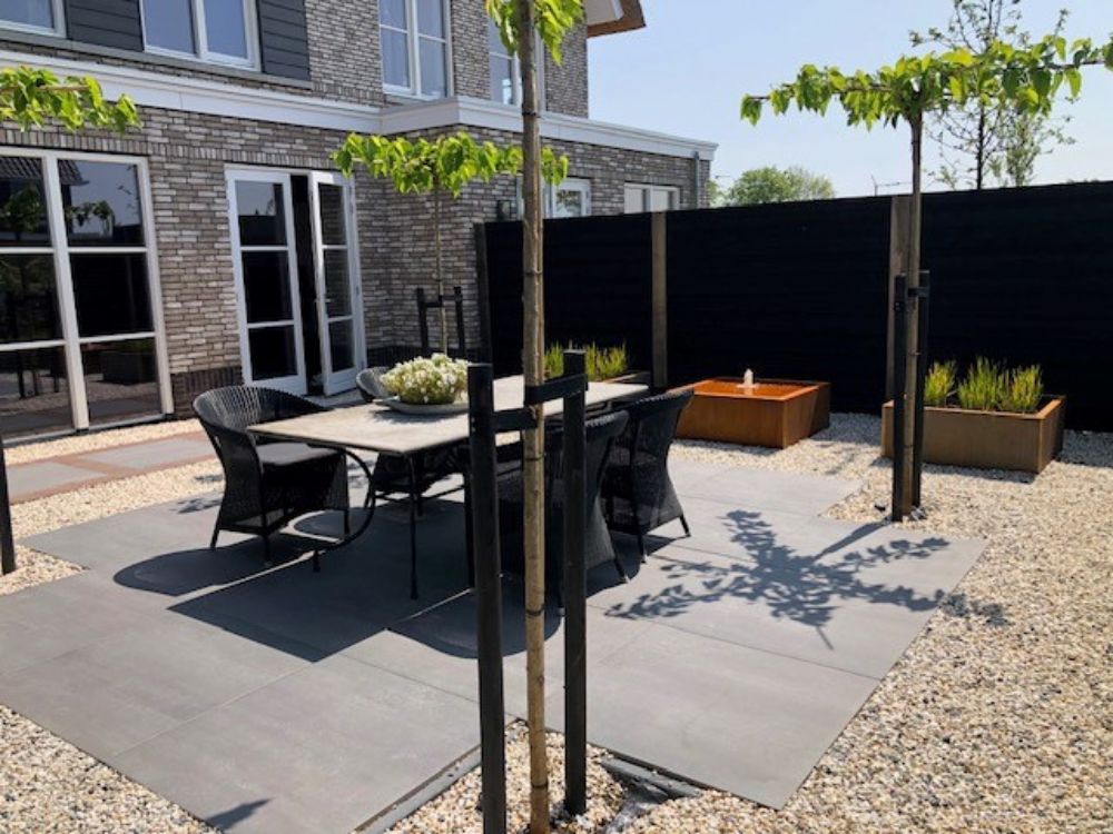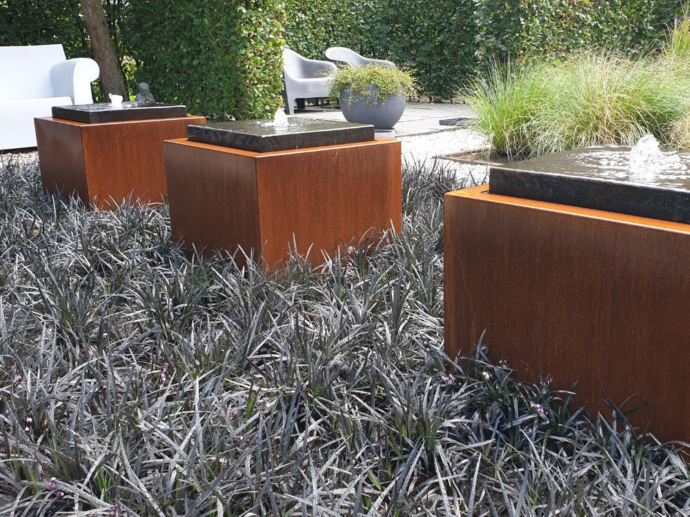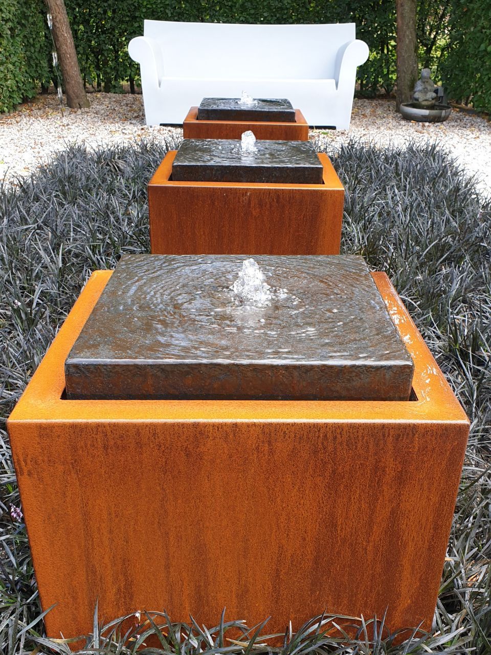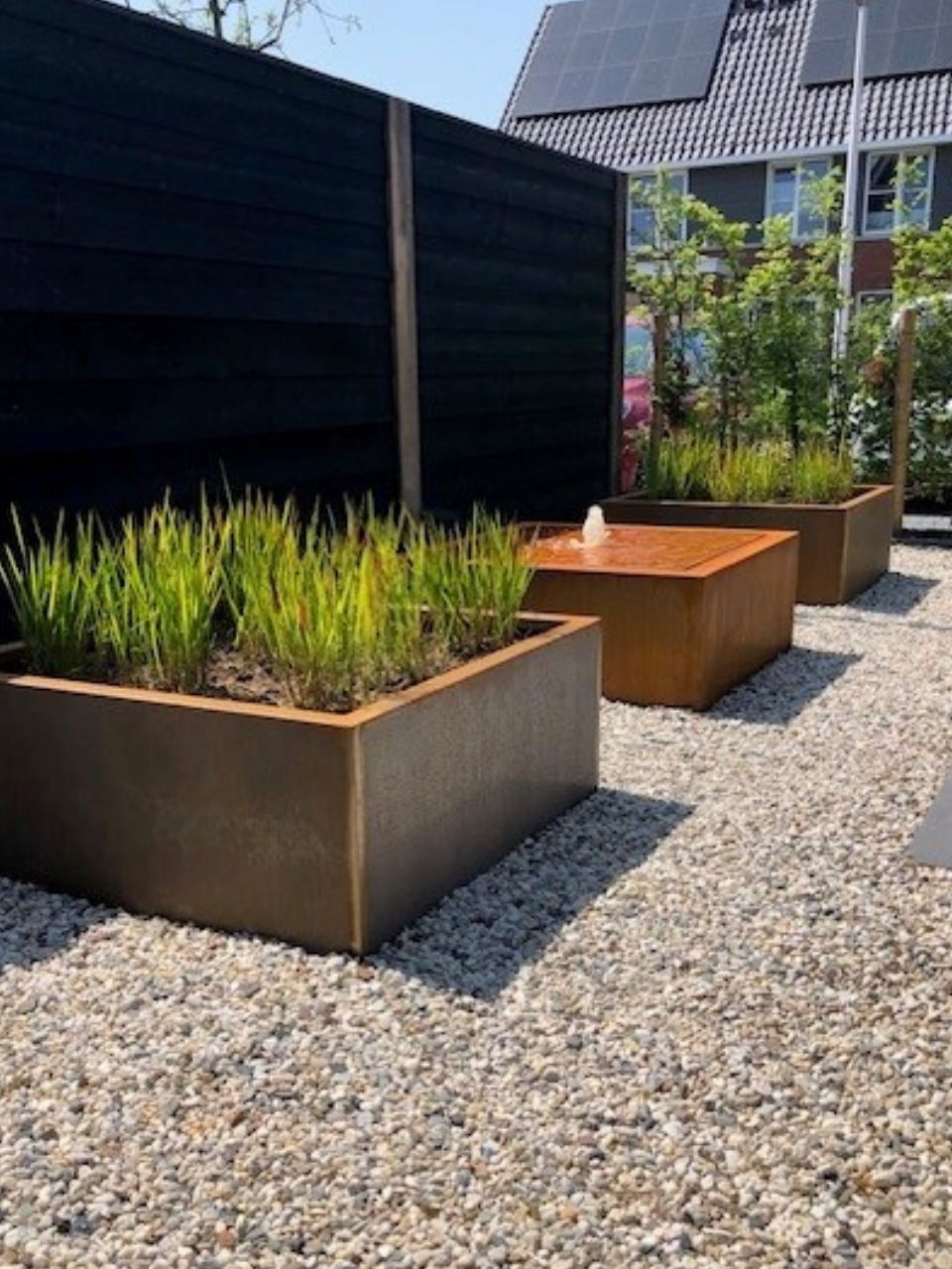 - I tavoli d'acqua e le bordure in acciaio corten conferiscono un aspetto moderno.