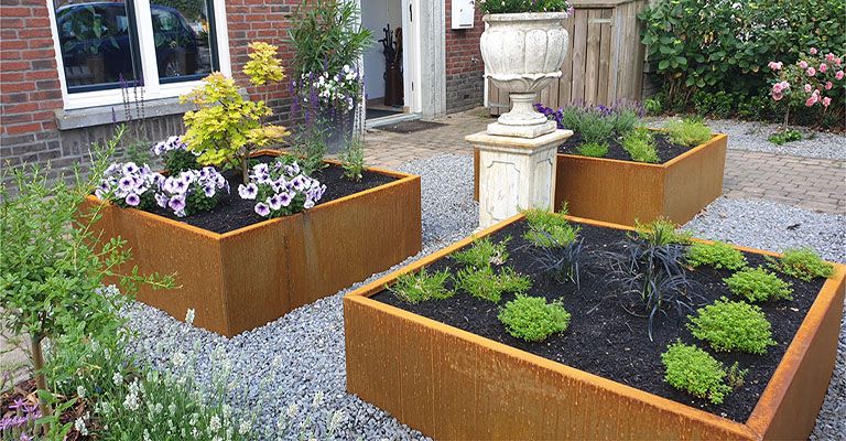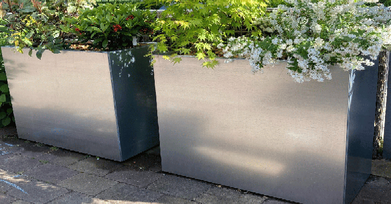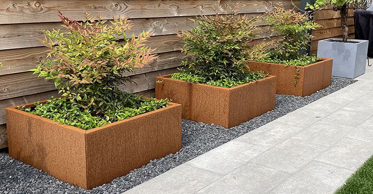 Le fioriere di grandi dimensioni sono disponibili in diversi materiali, ognuno con proprietà ed estetica uniche. Le fioriere in acciaio corten , ad esempio, sono resistenti agli agenti atmosferici e aggiungono un tocco industriale al giardino con il loro aspetto simile alla ruggine. Le fioriere in acciaio verniciato a polvere sono disponibili in diversi colori RAL e quindi hanno finiture colorate e possibilità di personalizzazione. Inoltre, sono protette dagli agenti atmosferici. Si adattano bene a un giardino moderno ed elegante.