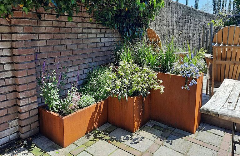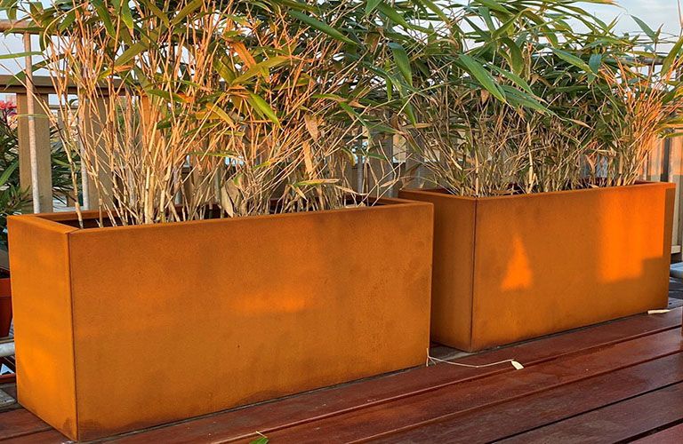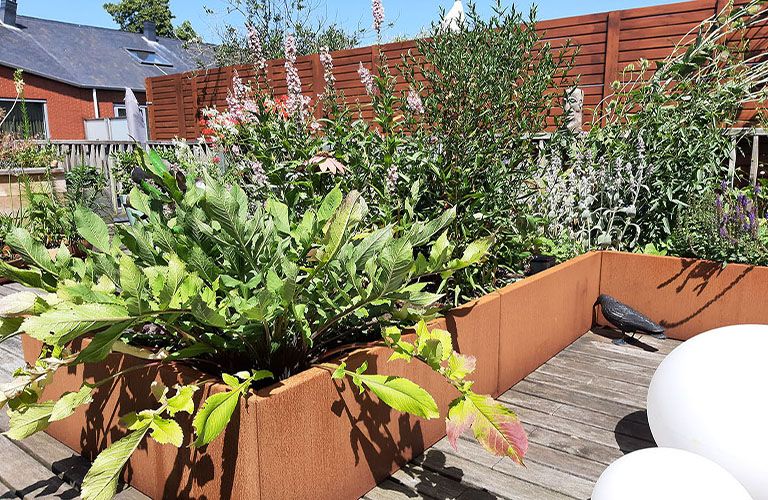 Il nostro cliente ha creato una maggiore privacy installando delle fioriere alte in acciaio corten ai lati della terrazza. L'ideale quando si vuole bere un drink in terrazza la sera, ma si vuole comunque tenere lontani gli sguardi indiscreti dei vicini. Le fioriere in acciaio corten abbinate all'erba alta o al bambù creano uno schermo da giardino sempreverde e una sensazione di solarità. La fioriera in acciaio corten come recinzione da giardino ha una dimensione di 1200x300x600 mm (lunghezza x larghezza x altezza). Questa fioriera occupa poco spazio a terra, ma garantisce il massimo effetto.