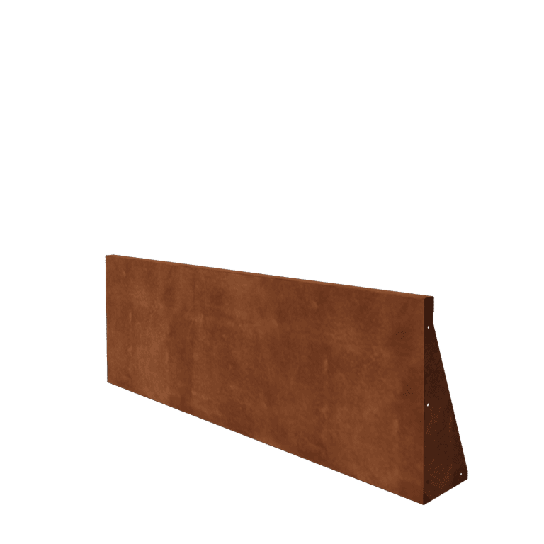 Il muro misura 150 x 50 cm ed è realizzato con una lamiera di acciaio corten spessa 2 mm, garantendo una struttura solida e robusta. Viene fornito completo di staffe di montaggio e materiale di fissaggio, facilitando l’installazione e il collegamento tra più pezzi. Grazie al bordo inferiore largo, il muro rimane stabile senza necessità di fissaggi al terreno.